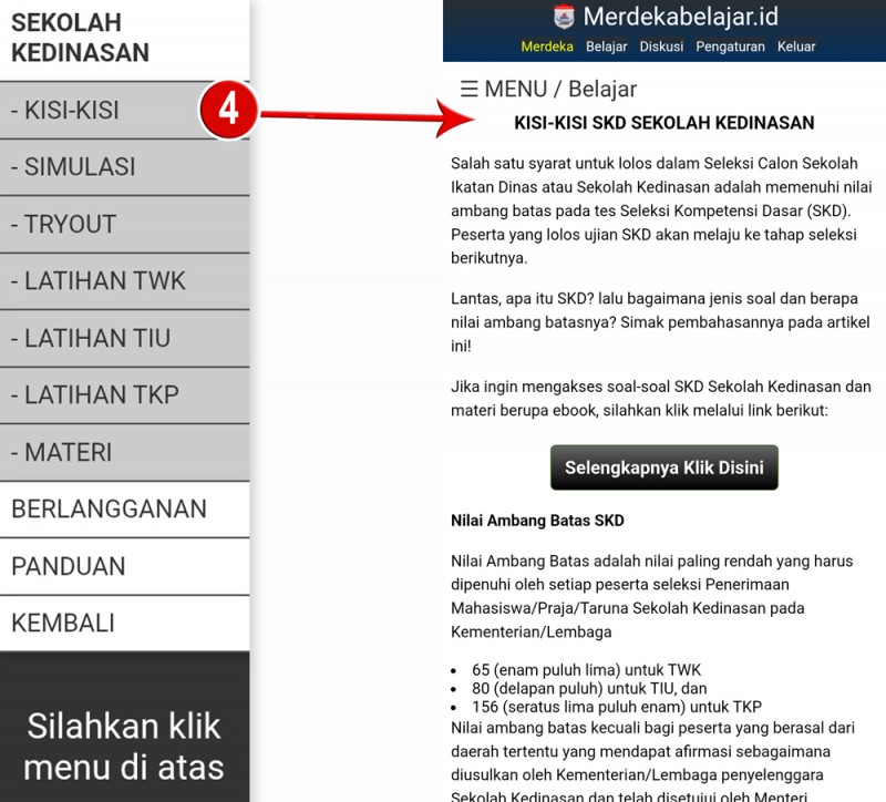 4. Menu KISI-KISI merupakan penjelasan tentang gambaran soal yang akan keluar saat Seleksi Kompetensi Dasar (SKD). - [ Lihat ]