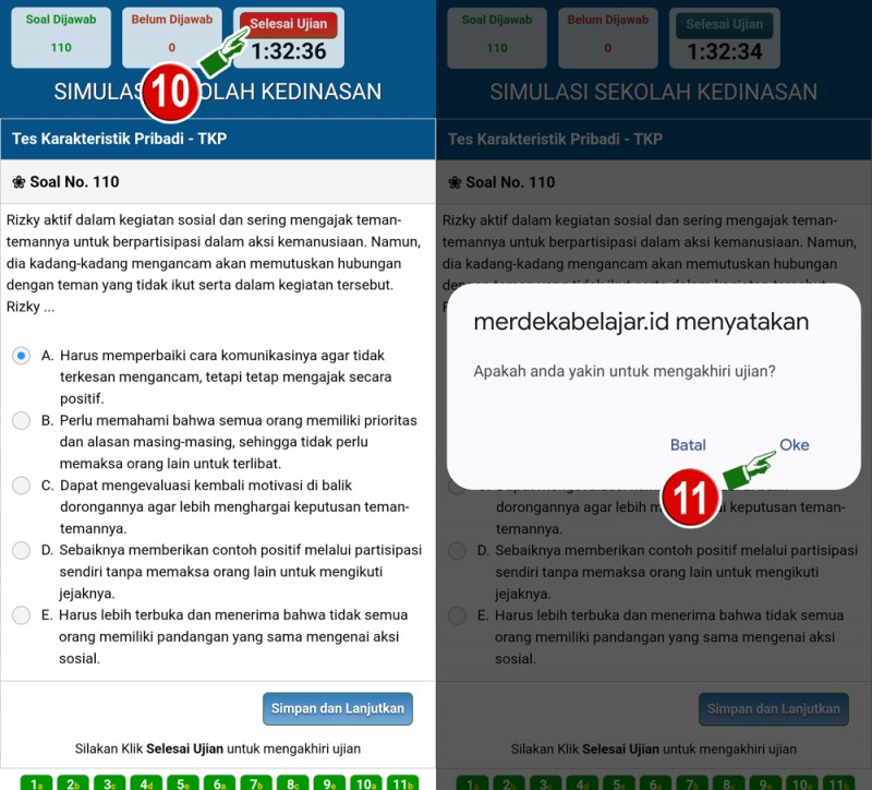 10. Jika telah menjawab semua soal, silakan klik Selesai Ujian (posisinya di sudut kanan atas berwarna merah)